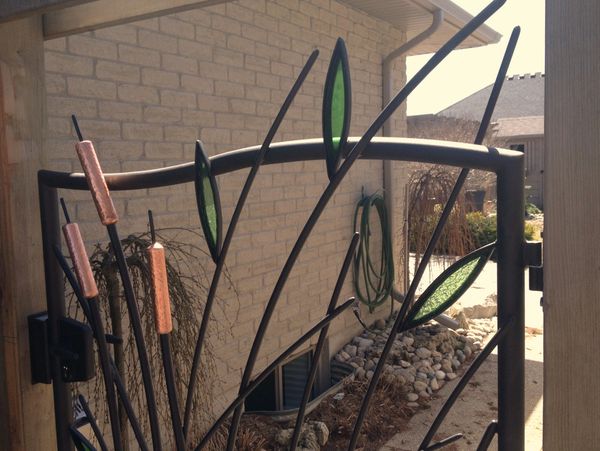 WHIMSICAL GARDEN GATE WITH GLASS LEAVES AND COPPER BULLRUSHES